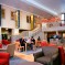 Inside, we transformed an uninspiring lobby atrium into an exciting new Arts Lounge. We added colorful furniture — deep blue settees, lively orange and red loungers, and low tables. Because ever-changing programs demand a variety of configurations, furniture can easily be rearranged to serve group gathering, gallery, presentation, performance, and other needs. Refreshment is offered through mobile coffee / snack carts and a prep kitchen. To draw people through the space, a vibrant new stair mural was also added during our renovations.