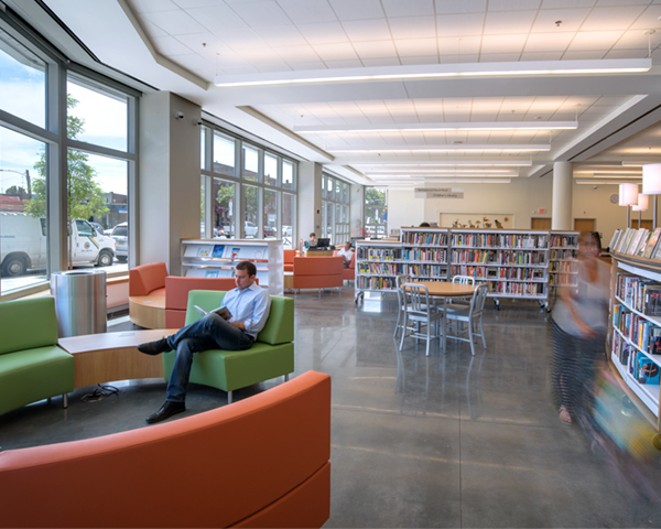 The Library is the first of the City’s Building Inspiration: 21st Century Libraries Initiative, whose goals are to reestablish the Library as a key resource and “portal to learning, public services, economic opportunity, recreation, and community engagement.” The library has general seating arrayed along the Broad Street side as well as clusters of flexible seating and collections defining areas for different age groups and activities. Enclosed spaces include a dividable multi-purpose room and a combination computer lab and “maker space.”