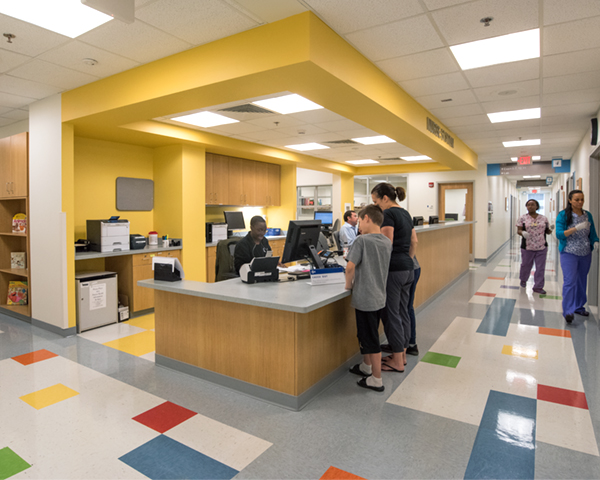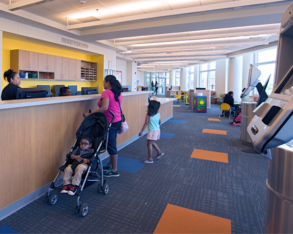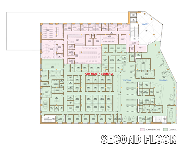 The City Health Center includes a pharmacy, dental suite, and radiology suite in addition to exam rooms and counseling spaces. Patients, often walk-ins, are screened in the outer waiting area and then directed to the appropriate section of the inner waiting area.