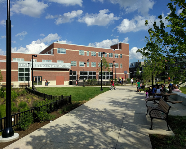 The recreation center houses a multipurpose space and computer room used by students in afterschool programs. The rec center, basketball court, and playground engage the surrounding residential neighborhood.