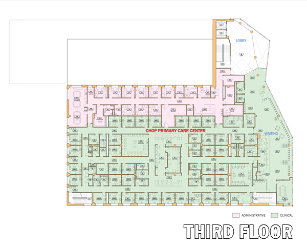 The upper CHOP floor contains exam rooms with a central nurse station. Patients are received in a single waiting area and then escorted to the appropriate exam room.