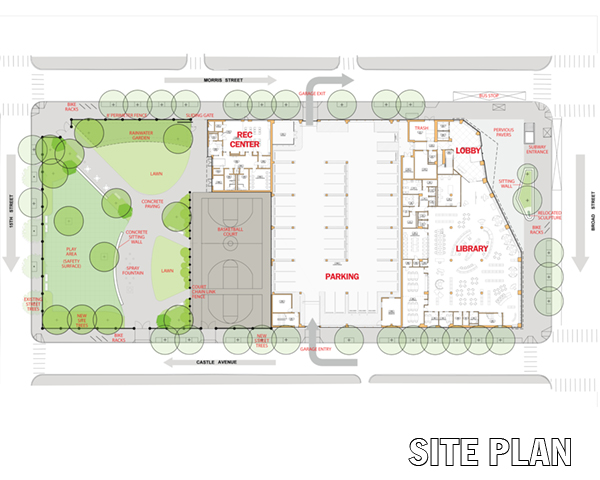 The site — extending from Broad Street to 15th Street and from Morris Street to Castle Avenue — is surrounded on three sides by 19th century townhouses. Broad Street is characterized by a vibrant mix of activities and uses. Originally lined with grand houses, it’s evolving as home to commercial activities and institutions that benefit from the high visibility and proximity to transit. The Center angles back at the corner of Broad and Morris to form an entry plaza, with a sitting wall and planting bed extending from an entrance to the Broad Street subway. “See the Moon,” a sculpture of mother and child by Evelyn Keyser, sits at the south end of the bed and addresses pedestrians on Broad Street. Enclosed parking is provided on-site for staff.