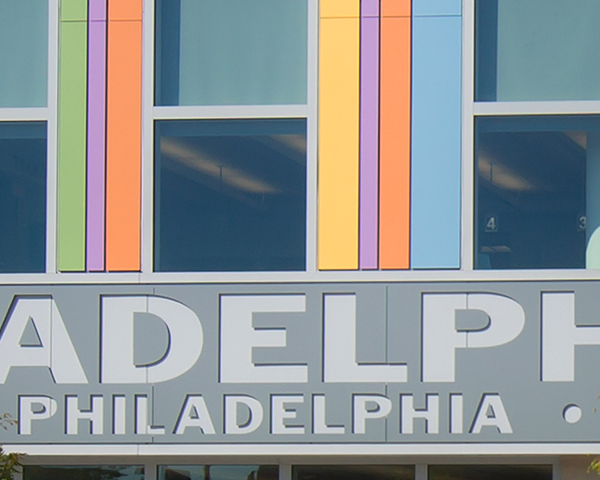 The Broad Street façade is highly transparent to engage passersby. The upper two stories containing the clinical spaces are cantilevered slightly to disengage from the column grid, enabling a rhythmic array of vertical glazed curtainwall units and striped metal panels. The panels display rainbow colors in an animated mix, suggesting the vibrant multicultural nature of the community. A continuous aluminum plate signband with punched-out letters identifies the building while adding a contrasting horizontal element. At street level, large windows between cast stone piers give views to and from the library. Together, these elements bring civic scale, individual and collective identity, and a touch of fun. Meanwhile, facades facing the residential streets combine more traditional red brick and punched window openings. A cast stone base and belt courses provide horizontal accents.